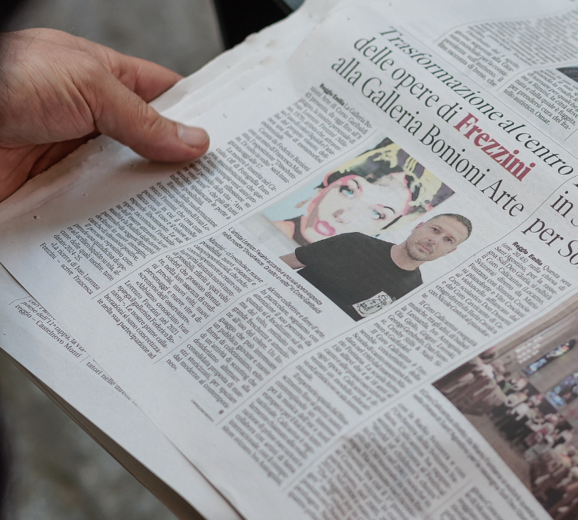 PRESS Intervista al pittore Ivan Lorenzo Frezzini: “Fluid art che crea metamorfosi” di Aurora Guerriero, TELA NARRANTE 2025 Solo exhibition “DISSOLVENZE” Galleria Bonioni Arte – Artribune 2025 “DISSOLVENZE” Galleria Bonioni Arte – Small Zine arte contemporanea Solo exhibition “DISSOLVENZE” Galleria Bonioni Arte Arte – Julliet Magazine 2025 Solo exhibition “DISSOLVENZE” Galleria Bonioni Arte – Aise agenzia internazionale stampa estero 2025 “I VOLTI DI IVAN LORENZO FREZZINI IN MOSTRA A REGGIO EMILIA” – Move Magazine 2025 “NOI CI SIAMO GUARDATI” Art Gallery 28/10 Alessandria – Exibart 2025 Dalle “DIFFUSIONI” un nuovo volto per Matilde – La Libertà 2025 “DIFFUSIONI il nuovo volto di Matilde di Canossa” Castello di Bianello – Stampa Reggiana 2025 Solo exhibition “PRINCIPIUM” Museo Il Correggio – Comune di Correggio 2024 “LA MIA FLUID PAINTING” Galleria Anna Breda Padova – Exibart 2024 Live paintin Museo Il Correggio – Il resto del carlino 2024 Premio MEDIOLANUM Arte Fiera Genova 2024 – Liguria notizie 2024 “LA BELLEZZA DELLE DIFFERENZE NELL’ ARTE” sede INAIL Roma – Roma per tutti 2023 Live painting “CANONI DIFFUSI” Teatro Bismantova – Redacons 2023 “CANONI DIFFUSI” Chaos Art Gallery – Il Caffè quotidiano Parma “CANONI DIFFUSI” – Redacons 2022 “CANONI DIFFUSI” AL MAVARTA – Il gazzettino santilariese 2022